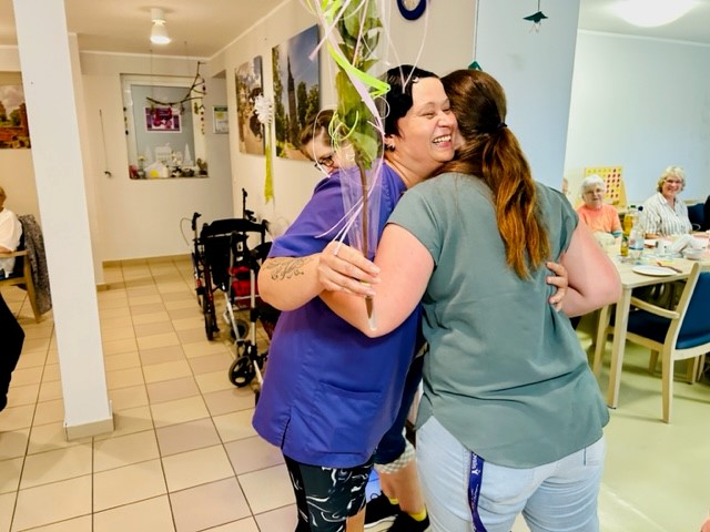 Die Mitarbeiterinnen bekamen ebenfalls liebe Worte, ein schönes Blümchen und eine feste Umarmung als Zeichen der Wertschätzung. Anschließend konnten alle leckere Bratwürstchen, Salate und Brötchen sowie den heißbegehrten Eierlikör genießen.