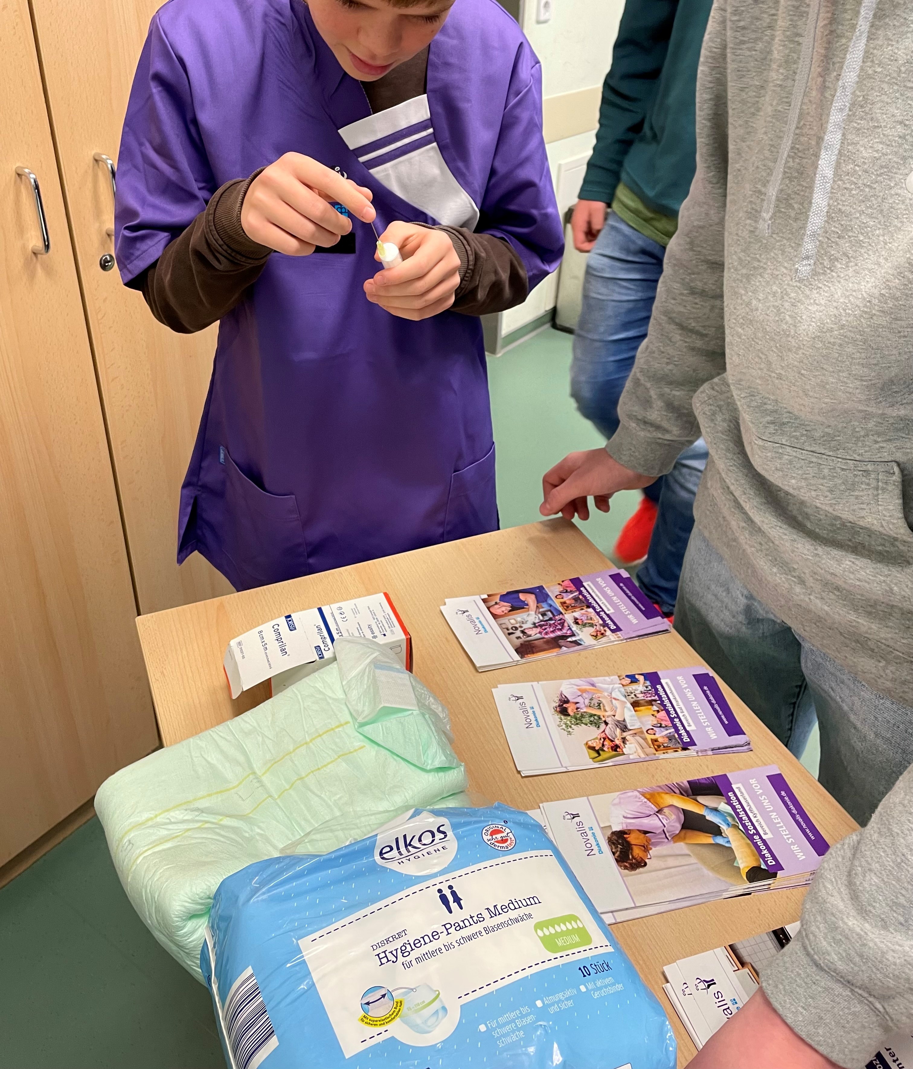 Als letzte Veranstaltung in diesem Jahr zum Thema "Schule trifft Wirtschaft" waren wir gestern in der Regelschule in Roßleben zu Gast. In 6 Durchgängen zu je einer Unterrichtsstunde informierten wir Schüler der 8. und 9. Klassen über uns und die Arbeit in der Novalis Diakonie. Themenschwerpunkt war die Vorstellung des Ausbildungsberufes Pflegefachfrau/Pflegefachmann. Praktische Anwendungen wie einen Verband anlegen, Windeln und Spritzen aufziehen waren dabei für die Jugendlichen besonders interessant.
